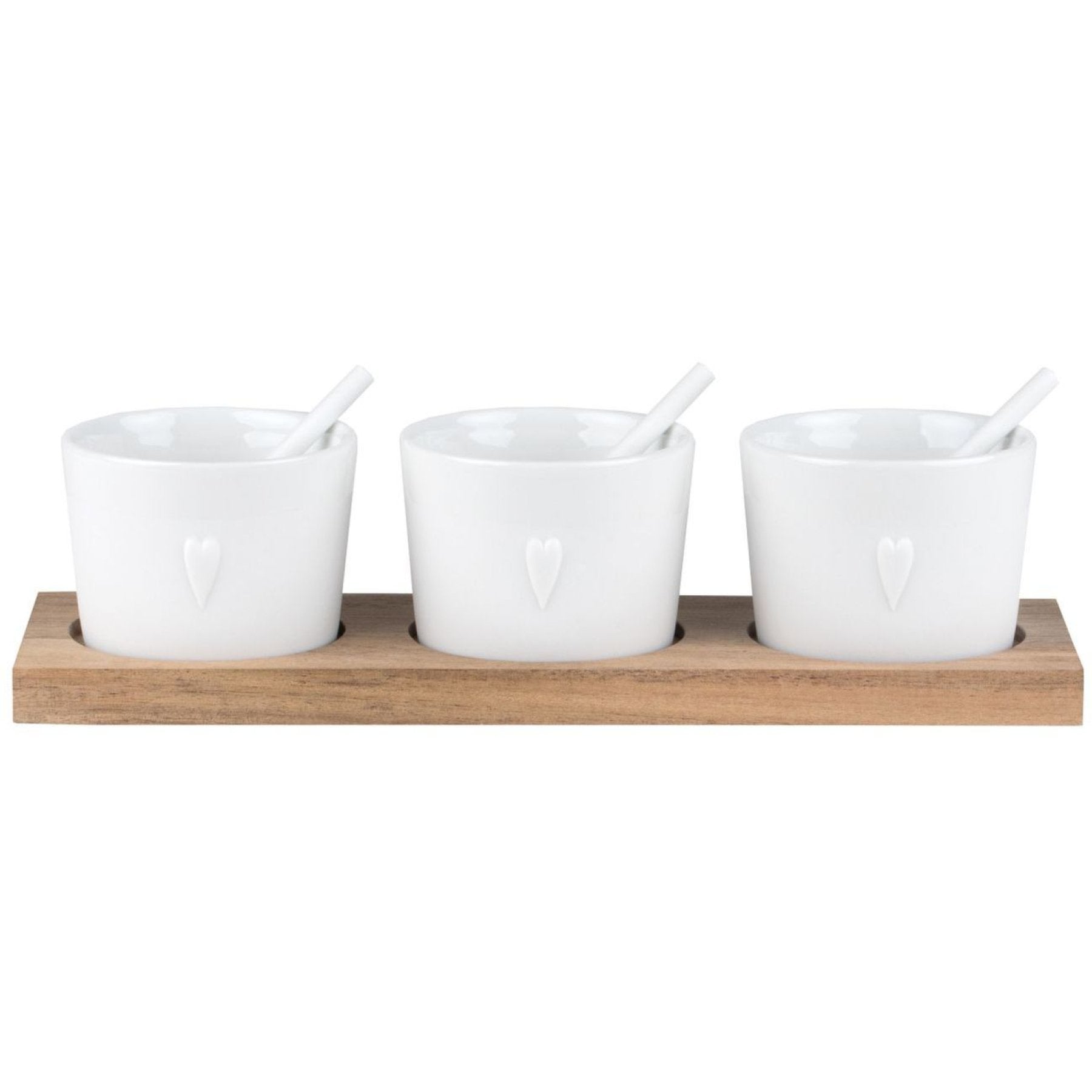 Schalen und Löffel: Porzellan (teilweise glasiert), Tablett: unbehandeltes Akazienholz